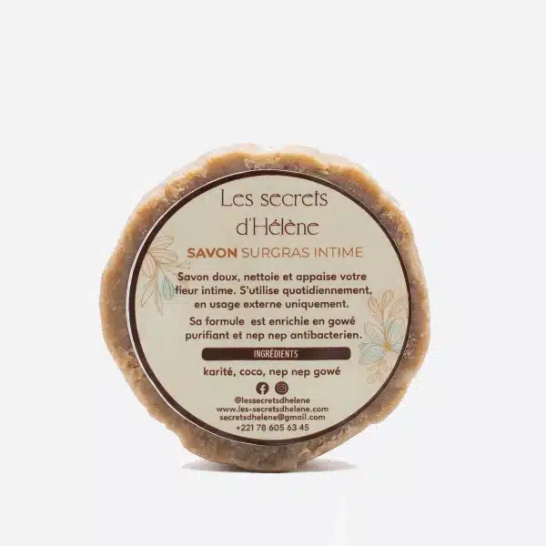 Savon intime naturel : doux et surgras formulé avec du Nep Nep, du Gowe, du Karité et de l’Huile de Coco.