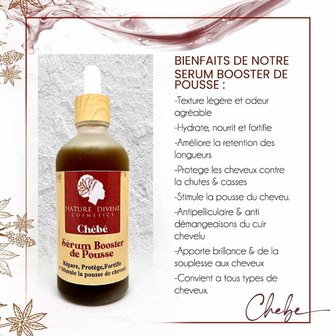 Découvrez le Sérum Booster de Pousse de cheveux au Chébé de Nature Divine Cosmetics! Ce sérum est un soin capillaire intensif spécialement formulé pour activer la croissance des cheveux et renforcer leur vitalité. Inspiré des rituels traditionnels du Tchad, ce sérum associe la poudre authentique de Chébé à un puissant mélange d’huiles végétales naturelles reconnues pour stimuler la pousse et améliorer la santé du cuir chevelu.