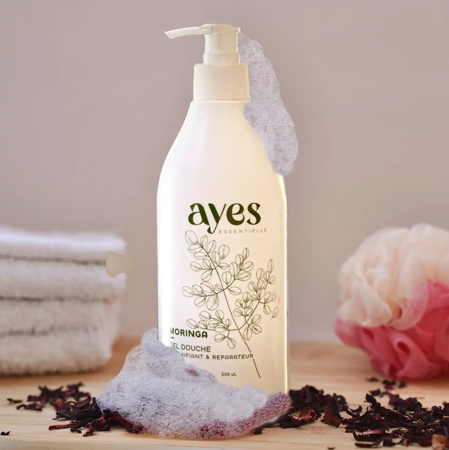 Découvrez la fraîcheur pure et les bienfaits revitalisants du gel douche infusé aux feuilles de moringa AYES Essentielle.