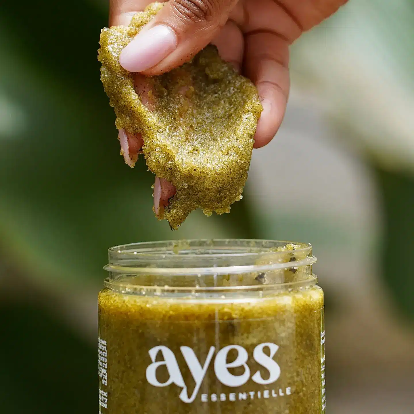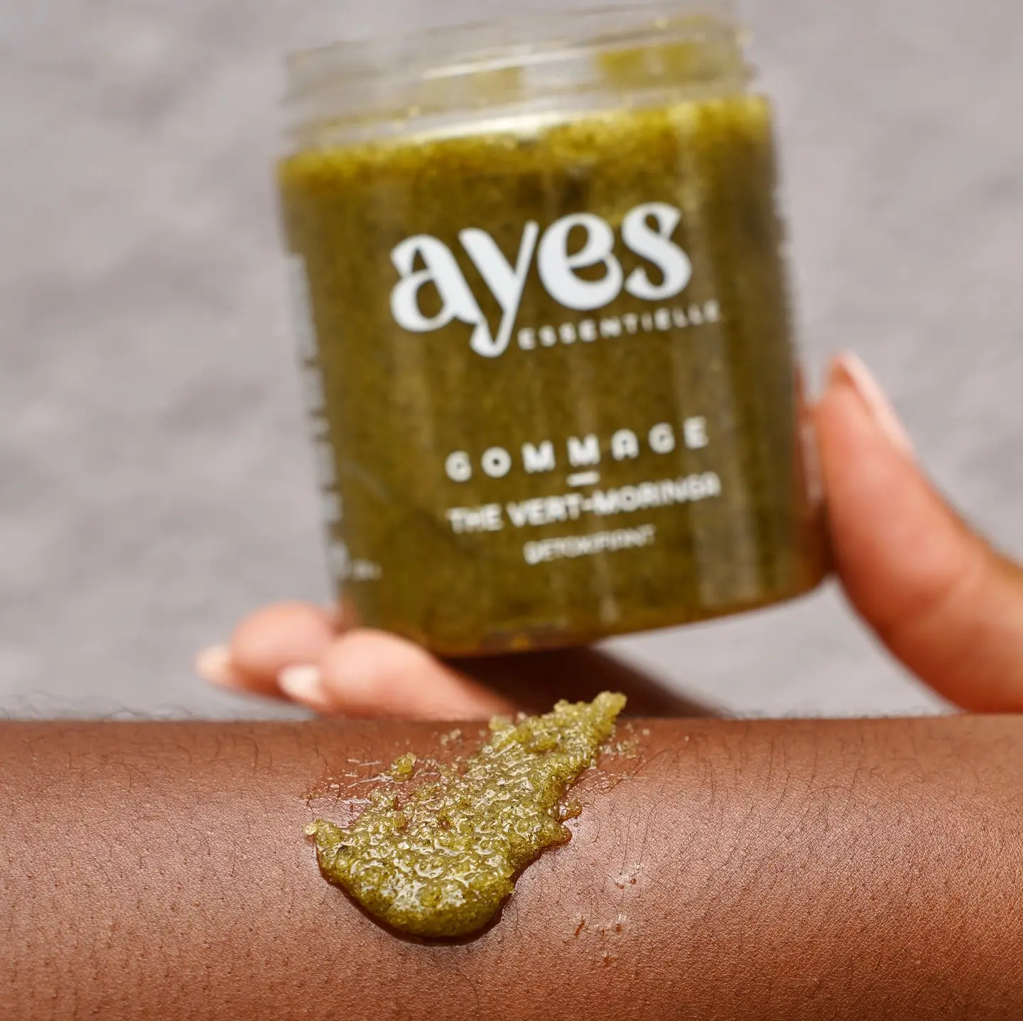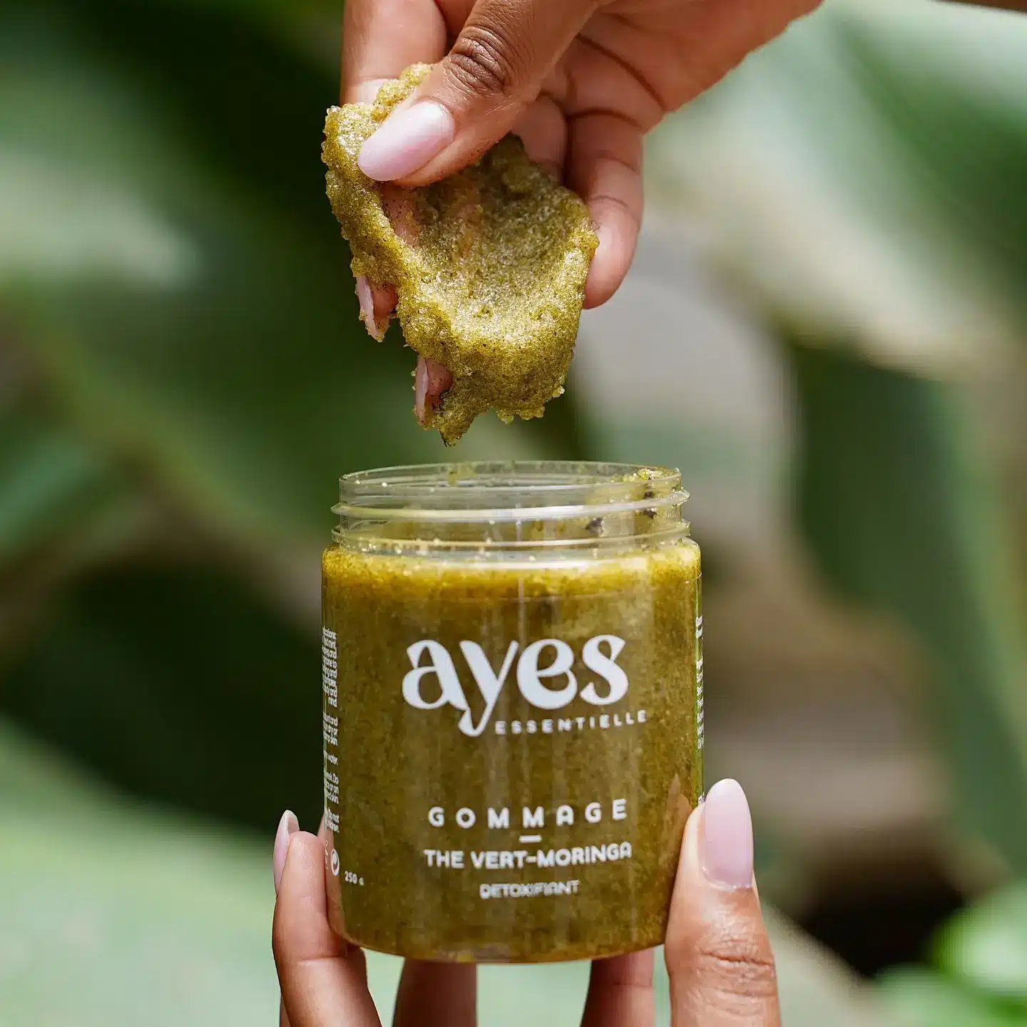 Le Gommage Thé Vert – Moringa & Menthe Ayès Essentielle exfolie, purifie et tonifie en douceur.